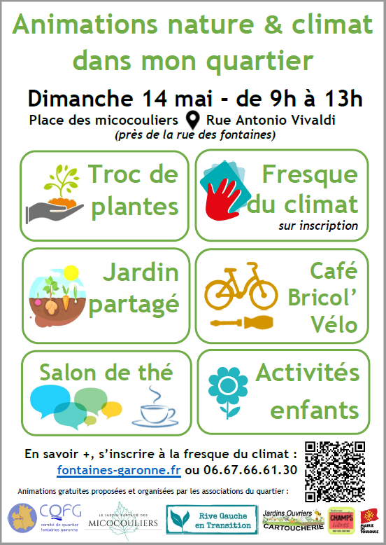 Organisé par le Comité de quartier Fontaines Garonne, le Jardin partagé des Micocouliers, Rive gauche en Transition avec l'aide du jardin ouvrier de la cartoucherie, champs libres et la mairie de Toulouse En savoir + sur notre site (lien externe, ouverture dans une nouvelle fenêtre) S'inscrire directement à la fresque du climat (gratuit, places limitées) en suivant ce lien (lien externe, ouverture dans une nouvelle fenêtre)