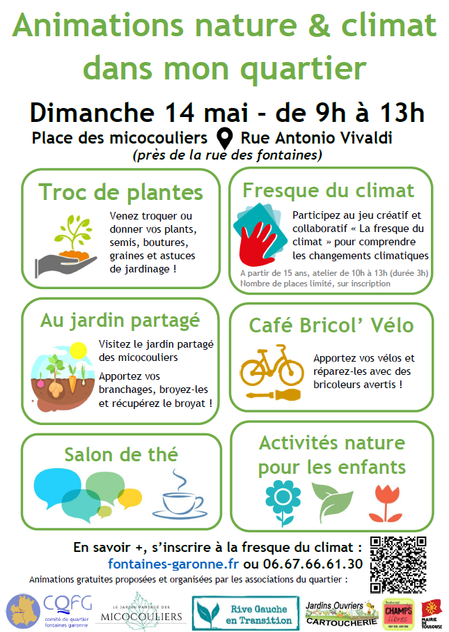 Dimanche 14 mai de 9h à 13h, rendez-vous place des micocouliers (rue Antonio Vivaldi) pour des animations autour de la nature et du climat !